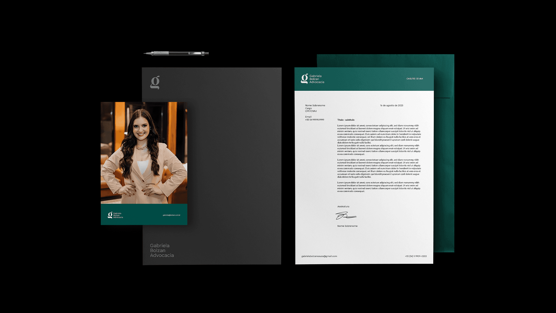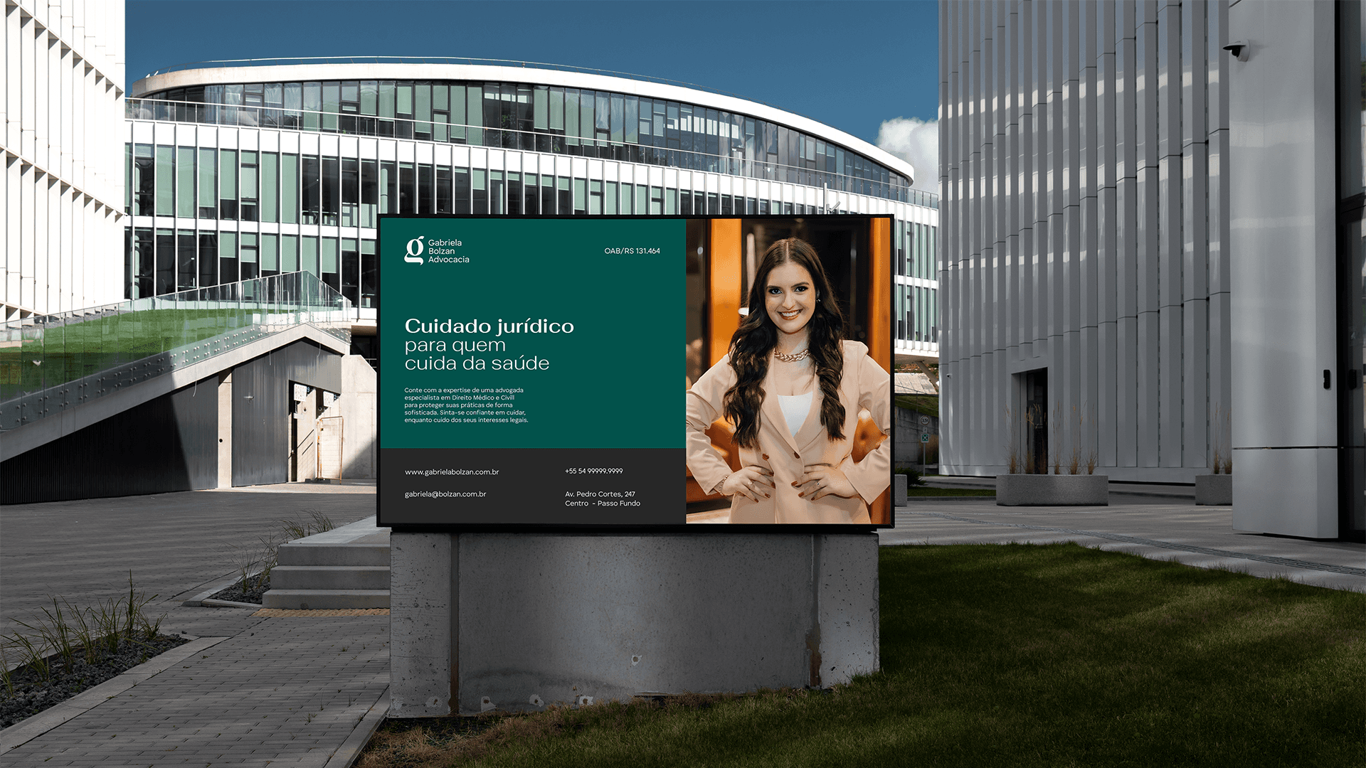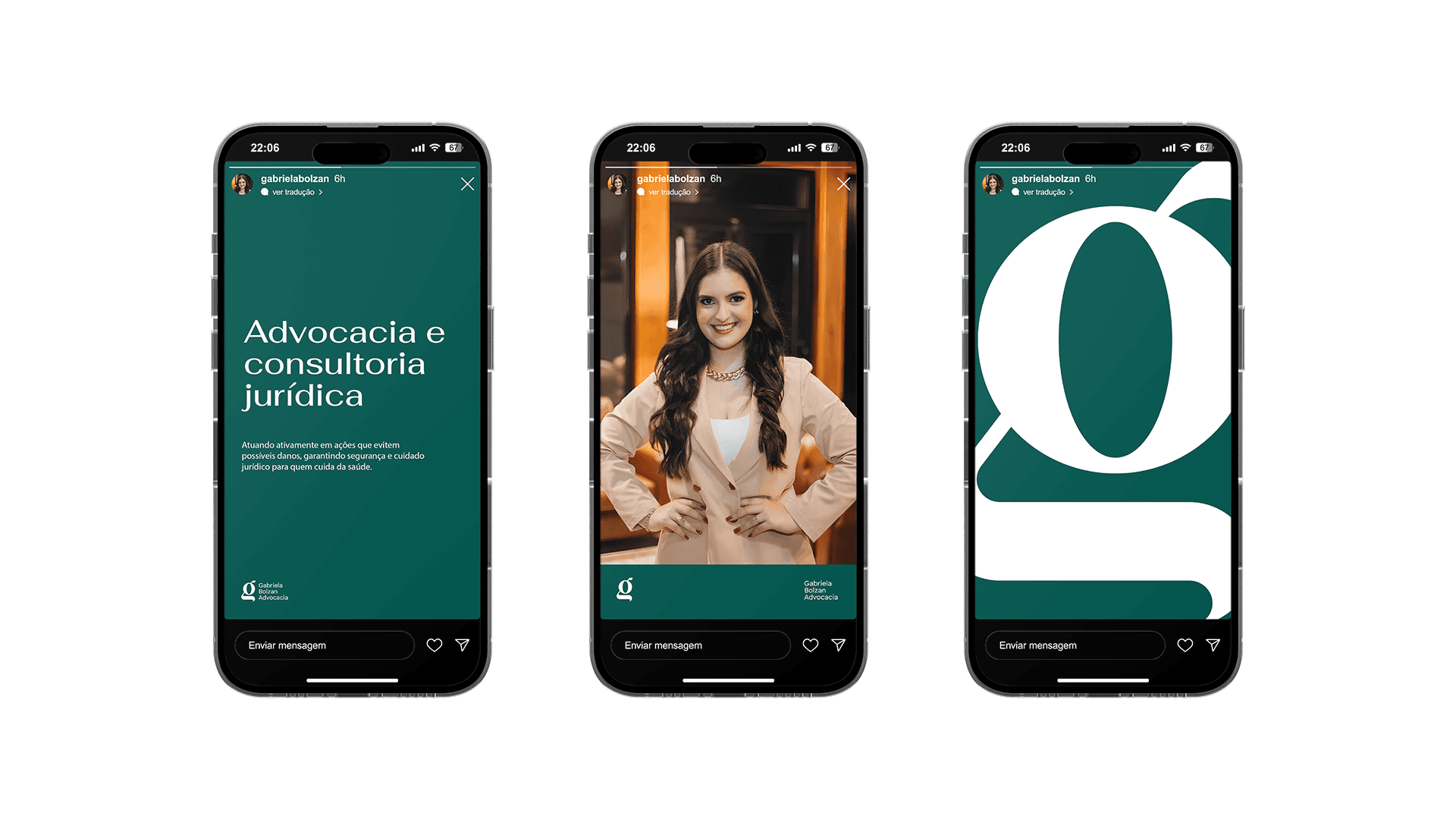 Todo o design foi minuciosamente pensado, visando conectar os nichos de Direito e medicina para comunicar segurança, estabilidade e sofisticação, além de toda a elegância que, para Gabriela, é um diferencial essencial no seu posicionamento profissional.